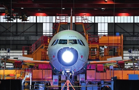 空客天津總裝線的首架空客A321飛機上線總裝(2022年11月9日攝) 趙子碩攝/本刊