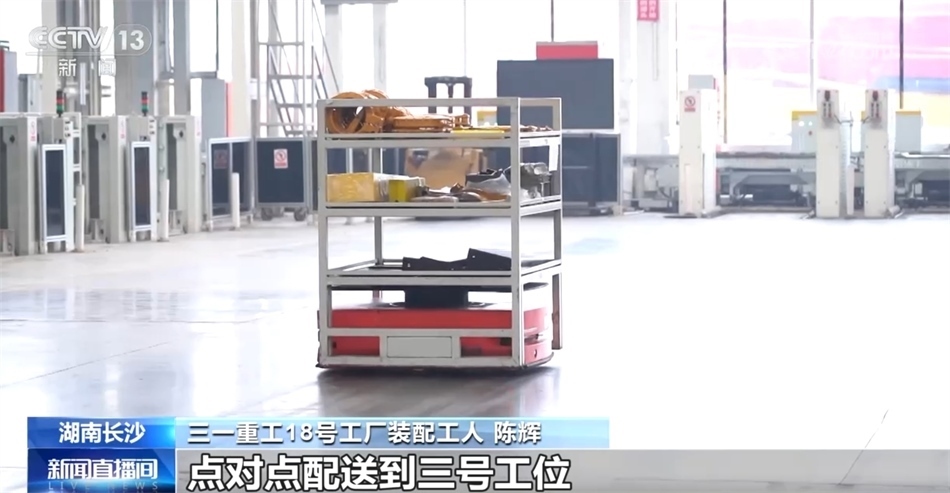 三一重工18號(hào)工廠裝配工人 陳輝:對(duì)于我們一個(gè)組裝工人來說,最麻煩的事莫過于找料和取料。我們過去都是自己找、自己拿,現(xiàn)在我們都是通過AGV小車點(diǎn)對(duì)點(diǎn)配送到三號(hào)工位。