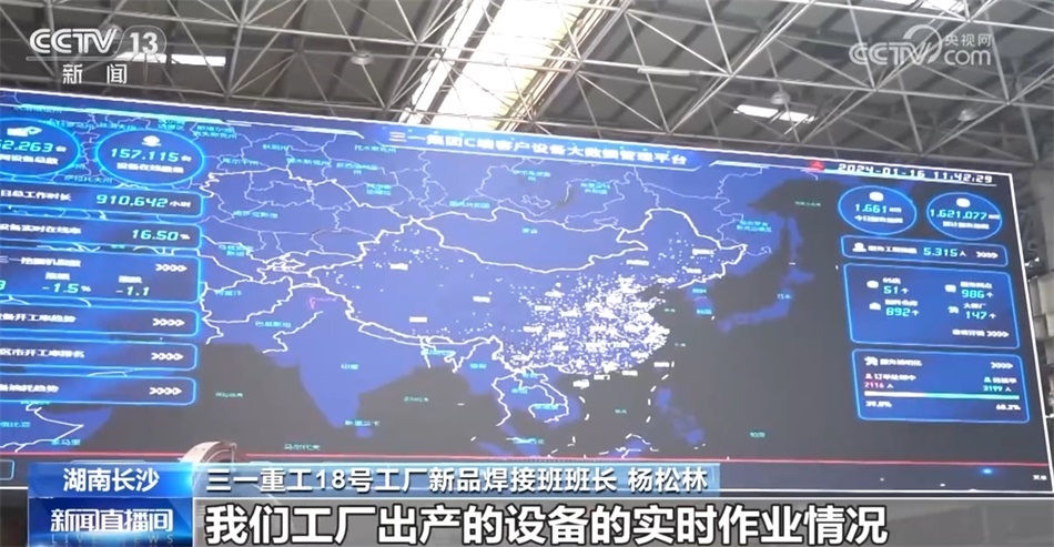 三一重工18號(hào)工廠新品焊接班班長(zhǎng) 楊松林:來我們“燈塔工廠”參觀,我們都會(huì)看到一個(gè)超級(jí)大的屏幕,每一個(gè)閃光點(diǎn)都代表著我們工廠出廠的設(shè)備的實(shí)時(shí)作業(yè)情況。這些閃光點(diǎn)最后就形成了一個(gè)三一的挖掘機(jī)指數(shù),就相當(dāng)于我們業(yè)內(nèi)工程行業(yè)的一個(gè)晴雨表,其實(shí)我們還是挺自豪的。