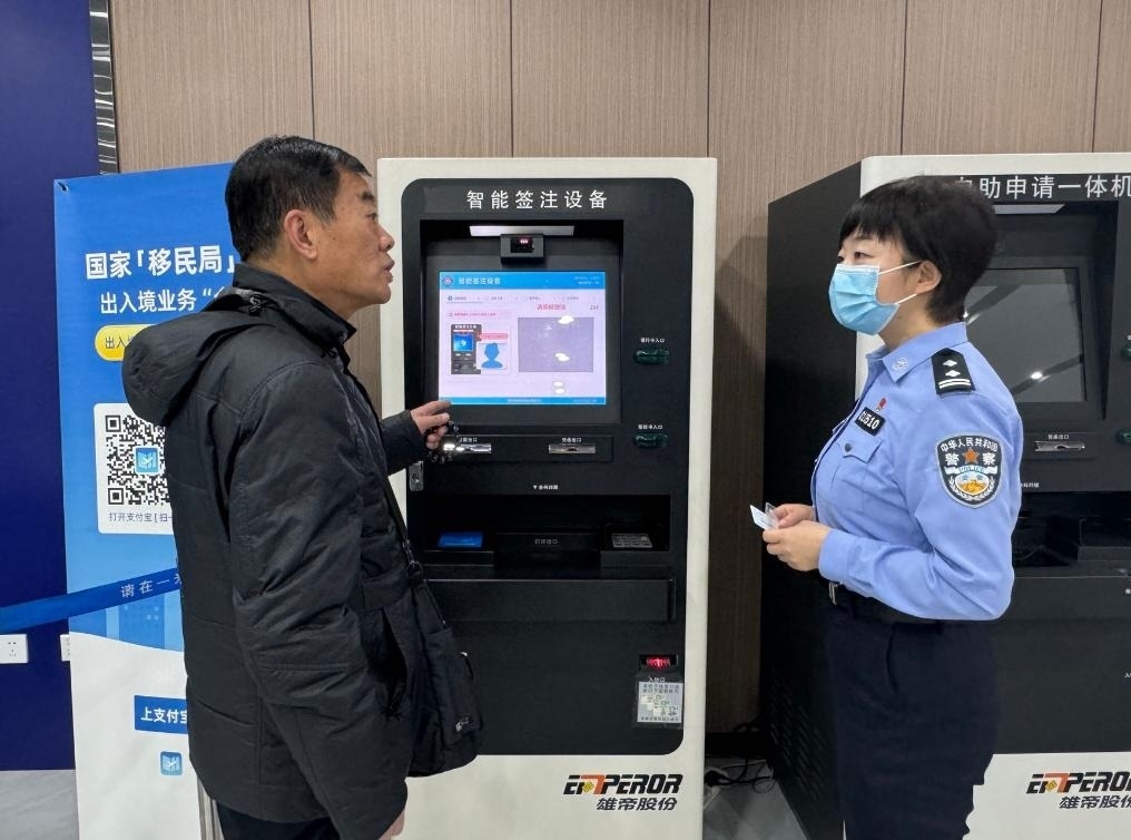 1月11日,在甘肅省蘭州市公安局出入境接待大廳,工作人員引導(dǎo)前來辦理出入境證件的市民使用智能簽注機(jī)。新華社記者 任延昕 攝