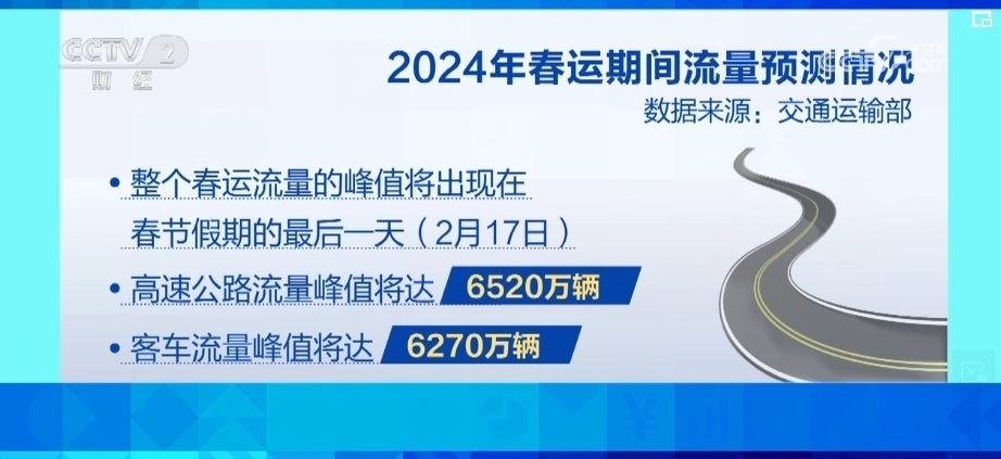交通運輸部預(yù)計,2024年春運期間,全國公路網(wǎng)日均流量將達3720萬輛,比2023年同期增長7.5%。整個春運流量的峰值將出現(xiàn)在春節(jié)假期的最后一天,也就是2月17日,高速公路流量峰值將達6520萬輛,客車流量峰值將達6270萬輛。