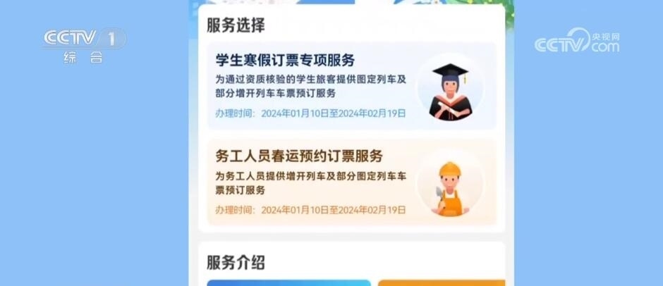 今年春運(yùn),鐵路部門推出預(yù)約購(gòu)票和預(yù)填購(gòu)票兩項(xiàng)購(gòu)票新方式,預(yù)約購(gòu)票功能專門針對(duì)學(xué)生和務(wù)工人員。符合條件的學(xué)生旅客(已通過學(xué)生優(yōu)惠資質(zhì)核驗(yàn)且有剩余優(yōu)惠乘車次數(shù))可通過“學(xué)生寒假訂票專項(xiàng)服務(wù)”專區(qū)預(yù)約購(gòu)買春運(yùn)期間的火車票。已通過實(shí)名制核驗(yàn)的務(wù)工人員可通過“務(wù)工人員春運(yùn)預(yù)約訂票服務(wù)”專區(qū)預(yù)約購(gòu)買春運(yùn)期間火車票。