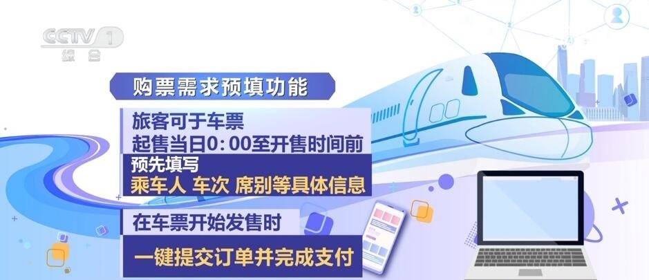 鐵路部門今年還增加了購(gòu)票需求預(yù)填功能,旅客可于車票起售當(dāng)日0:00至開售時(shí)間前,預(yù)先填寫乘車人、車次、席別等具體信息,在車票開始發(fā)售時(shí)一鍵提交訂單并完成支付。