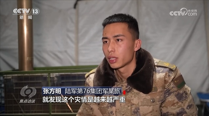 陸軍第76集團(tuán)軍某旅章新禹:“據(jù)我們了解,他家五間房屋全部開(kāi)裂,家人在院子里面搭了一個(gè)帳篷,我們優(yōu)先讓他回去解決自己的事情,然后再返回部隊(duì)?!?/p>