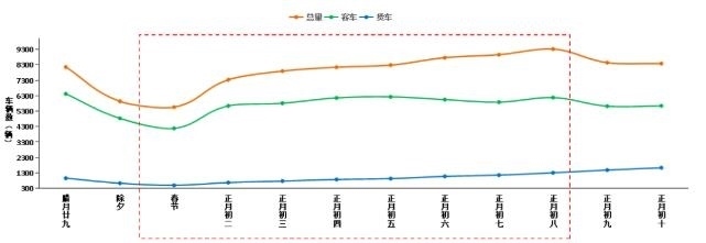 預(yù)計春節(jié)期間(含除夕),普通公路日均斷面交通量約7800輛,同比2023年增長約8.2%,如圖4所示。相較于高速公路,普通公路在春節(jié)期間流量較為平穩(wěn),沒有顯著高峰,在節(jié)前明顯下降,除夕達到最低值,初三以后交通量有所回升。