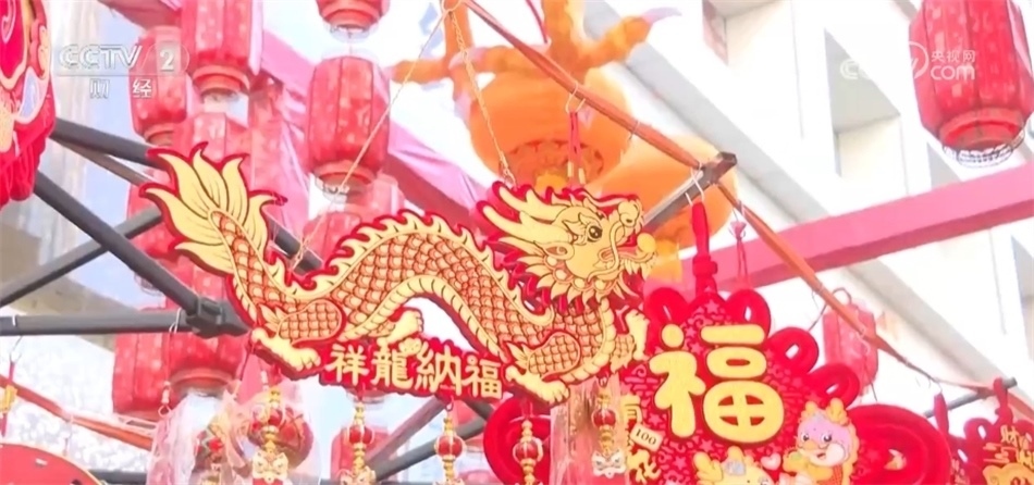 年集現(xiàn)場(chǎng),不少商家還將帶有龍?jiān)氐男履晷∥锛[放在醒目位置,包括福字貼、紅燈籠、龍玩偶、新年擺件等,無(wú)數(shù)個(gè)紅彤彤的小掛件營(yíng)造出濃厚的新年氛圍,吸引不少市民購(gòu)買。