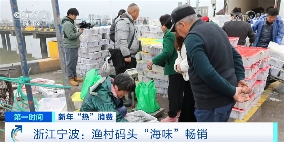 浙江寧波奉化區(qū)莼湖街道的漁村碼頭也進(jìn)入了年前最后的繁忙時(shí)刻。上午八點(diǎn),5艘運(yùn)輸船??吭趦?nèi)外碼頭上,據(jù)了解,一艘運(yùn)輸船有七八千箱漁獲物,近八成是帶魚(yú)。最近每天有百萬(wàn)斤東海魚(yú)貨就地銷售或運(yùn)往全國(guó)各地,預(yù)計(jì)將持續(xù)至臘月二十七。在碼頭邊桐照魚(yú)市場(chǎng)的攤位上,色澤鮮亮的帶魚(yú)、鯧魚(yú)、大黃魚(yú)等海產(chǎn)品琳瑯滿目,市民們忙著挑選,漁商們則賣力吆喝著。