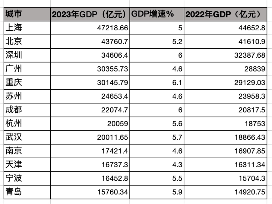 萬億城市的另一個看點還在于是“十強城市卡位戰(zhàn)”。2023年GDP第十城是南京,近1.75萬億。身后是天津、寧波和青島,3個城市在2023年GDP分別是1.67、1.64、1.57億元。