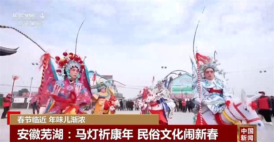 在安徽蕪湖花橋鎮(zhèn)咸定村,70多人組成的馬燈隊(duì)伍正在進(jìn)行精彩的表演。村民們身著戲裝,一手提馬首,一手揚(yáng)馬鞭,不斷變換陣式,引得人們連連叫好。