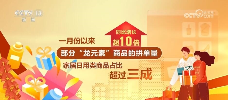 “龍元素”當仁不讓地成為今年春節(jié)的新“頂流”,不光有龍年的福字對聯(lián),還有龍年臺歷、龍寶寶毛絨玩具、龍年紅色內(nèi)衣、龍年中國結(jié)掛飾成為最熱銷的春節(jié)周邊商品前五名。1月份以來,部分“龍元素”商品的拼單量同比增長超10倍,其中,家居日用類商品占比超過三成。