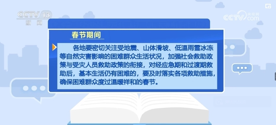 各地要密切關(guān)注受地震、山體滑坡、低溫雨雪冰凍等自然災(zāi)害影響的困難群眾生活狀況,加強(qiáng)社會(huì)救助政策與受災(zāi)人員救助政策的銜接,對(duì)經(jīng)應(yīng)急期和過(guò)渡期救助后,基本生活仍有困難的,要及時(shí)落實(shí)各項(xiàng)救助措施,確保困難群眾度過(guò)溫暖祥和的春節(jié)。