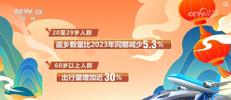 根據(jù)中國聯(lián)通智慧足跡對出行人群年齡的分析,2024年“反向春運(yùn)”成為新趨勢。數(shù)據(jù)顯示,20歲—29歲人群的返鄉(xiāng)數(shù)量比2023年同期減少了5.3%,而60歲以上人群的出行量卻增加了近30%。