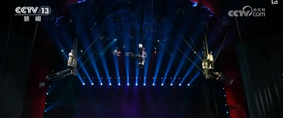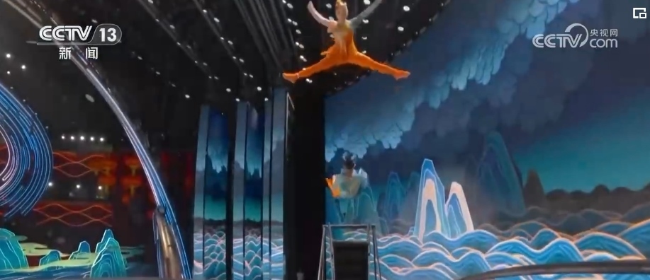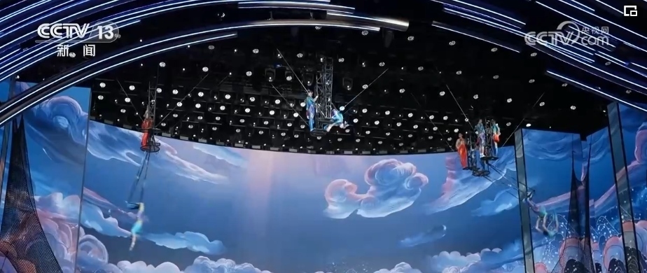 40多年來,春晚劇組首次在1號(hào)廳高空安裝飛人裝置,道具和技巧以及創(chuàng)意的融合,完美演繹了傳說中的魚躍龍門。