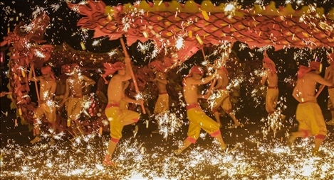 銅梁龍舞是首批國家級非物質(zhì)文化遺產(chǎn),被譽為“中華第一龍”。1500℃的鐵水瞬間在空中炸開,綻放成美麗的煙花雨。