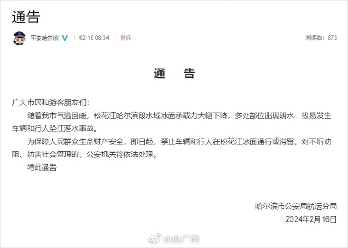 ·哈爾濱市公安局航運(yùn)分局提醒:松花江冰面禁止車(chē)輛和行人通行。