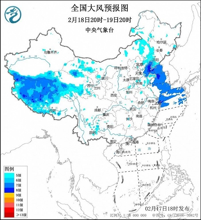 2月18日20時至19日20時,西藏中西部、青海南部、甘肅河西、內(nèi)蒙古西部和中部、遼寧西部和南部等地將有5~6級、陣風(fēng)7~9級的大風(fēng);渤海、渤海海峽、黃海大部海域、東海北部海域?qū)⒂?~8級、陣風(fēng)9~10級的大風(fēng)。