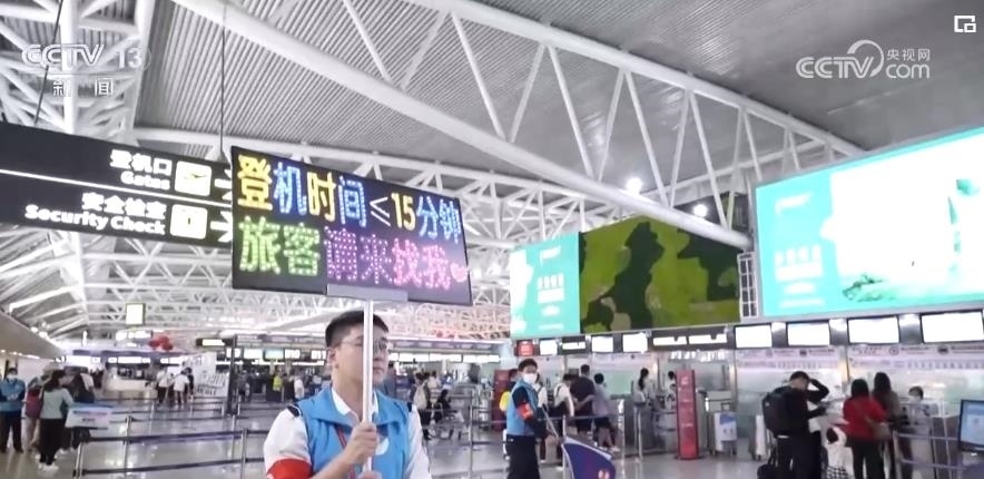 還有15分鐘登機(jī),這在平時不算晚??稍诔醢说某龈鄹叻謇?,如果沒有志愿者的及時指引,旅客就很有可能錯過飛機(jī)。