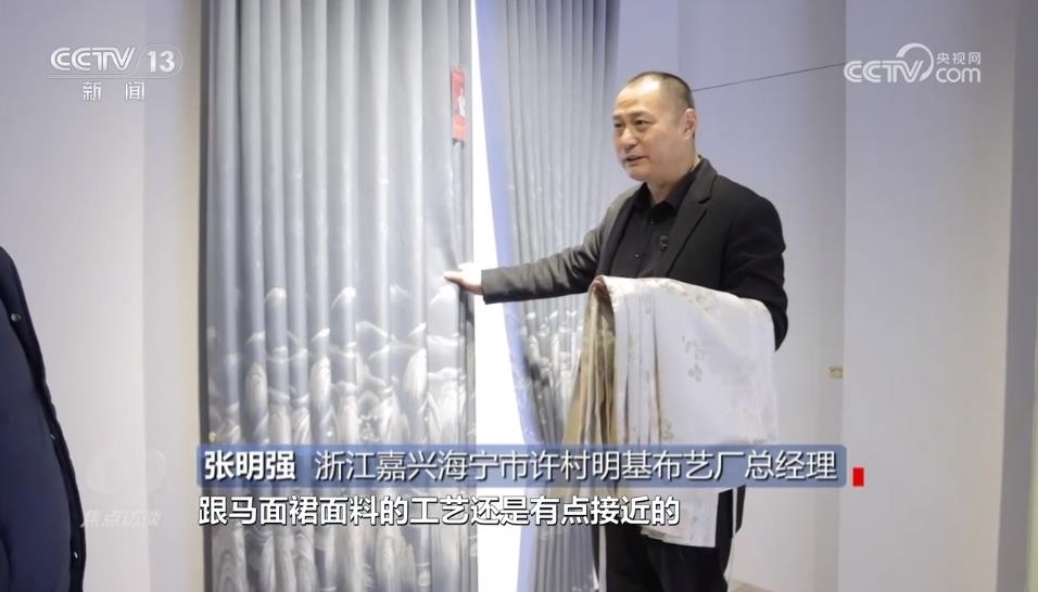 浙江嘉興海寧市許村明基布藝廠總經理張明強:“提花其實比較接近,跟馬面裙面料的工藝有點接近,但是馬面裙的密度會超過它很多?!?/p>