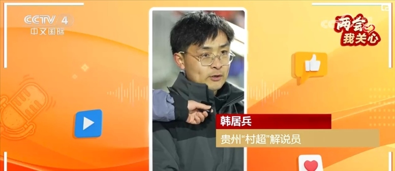 貴州“村超”解說員韓居兵表示他從小接觸到足球,看到前輩們踢球,現(xiàn)在有了“村超”,所以喜歡上了足球。