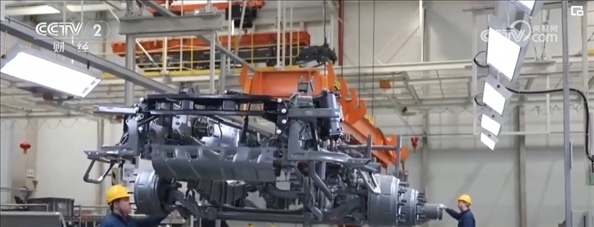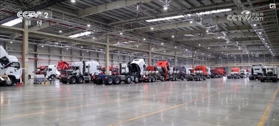 在山東濟(jì)南一家重卡生產(chǎn)企業(yè)的總裝車間里,貨運(yùn)機(jī)器人將重卡的車架依次傳送到各工作站,工人熟練地將發(fā)動(dòng)機(jī)、散熱器、輪胎等零件加裝到車架上。工作人員介紹,一輛重卡從接到訂單開始排產(chǎn)到交付客戶僅需五六天。