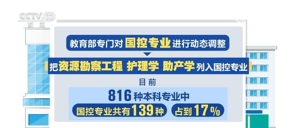 此次教育部專門對(duì)國(guó)控專業(yè)進(jìn)行了動(dòng)態(tài)調(diào)整,把資源勘察工程、護(hù)理學(xué)、助產(chǎn)學(xué)列入了國(guó)控專業(yè)。目前,816種本科專業(yè)中,國(guó)控專業(yè)共有139種,占到17%。未來(lái),國(guó)控專業(yè)范圍還將進(jìn)行“有進(jìn)有出”的動(dòng)態(tài)調(diào)整。
