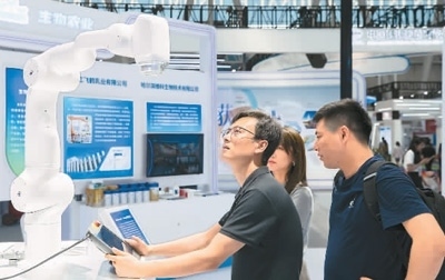 2023年6月16日,參展商在黑龍江省哈爾濱市舉辦的第三十二屆哈爾濱國際經(jīng)濟(jì)貿(mào)易洽談會現(xiàn)場展示醫(yī)療機(jī)器人的用法。