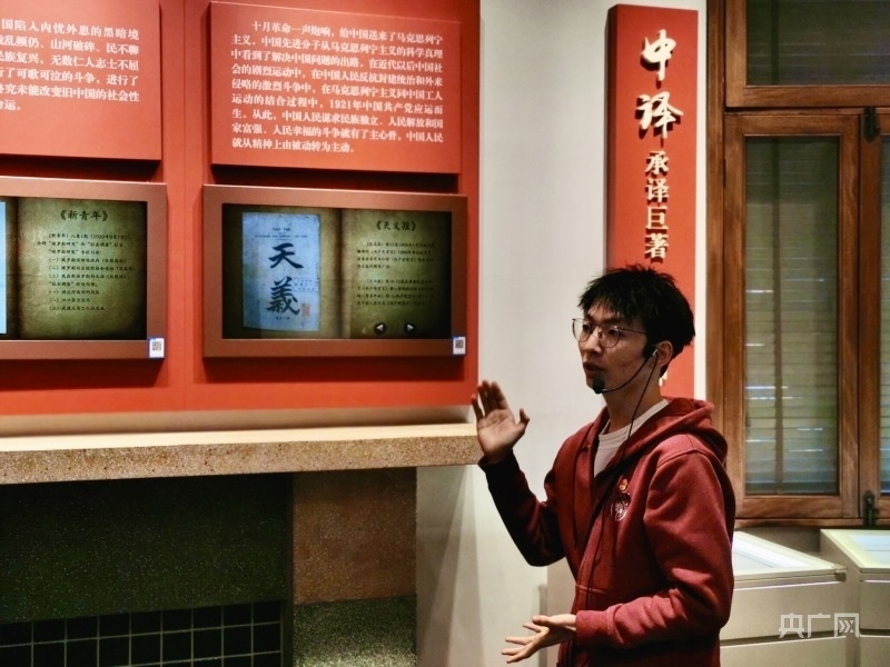 蔡薛文在《共產(chǎn)黨宣言》展示館內(nèi)講解(央廣網(wǎng)發(fā) 復(fù)旦大學(xué)黨委宣傳部供圖)