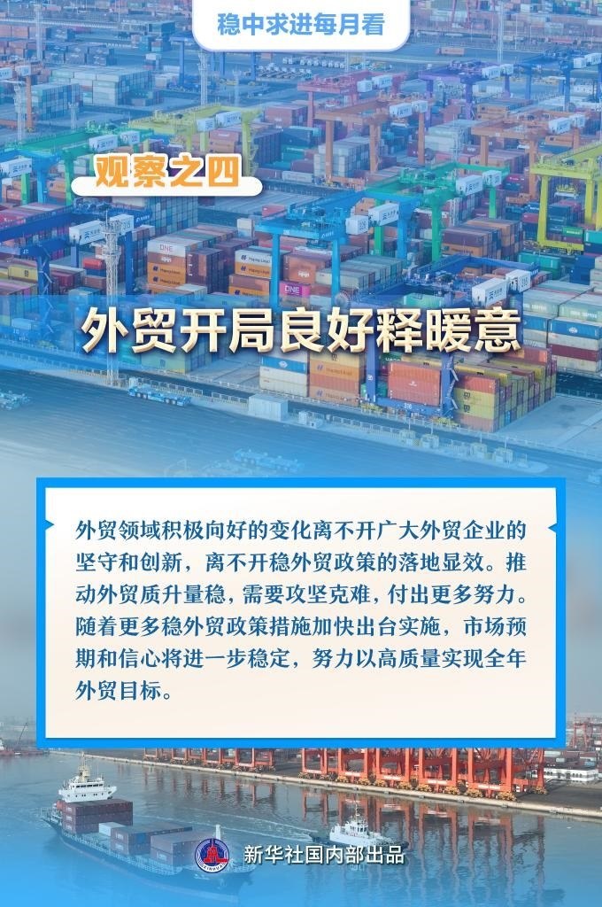 【記者觀察】外貿(mào)領(lǐng)域積極向好的變化離不開廣大外貿(mào)企業(yè)的堅(jiān)守和創(chuàng)新,離不開穩(wěn)外貿(mào)政策的落地顯效。推動(dòng)外貿(mào)質(zhì)升量穩(wěn),需要攻堅(jiān)克難,付出更多努力。隨著更多穩(wěn)外貿(mào)政策措施加快出臺實(shí)施,市場預(yù)期和信心將進(jìn)一步穩(wěn)定,努力以高質(zhì)量實(shí)現(xiàn)全年外貿(mào)目標(biāo)。