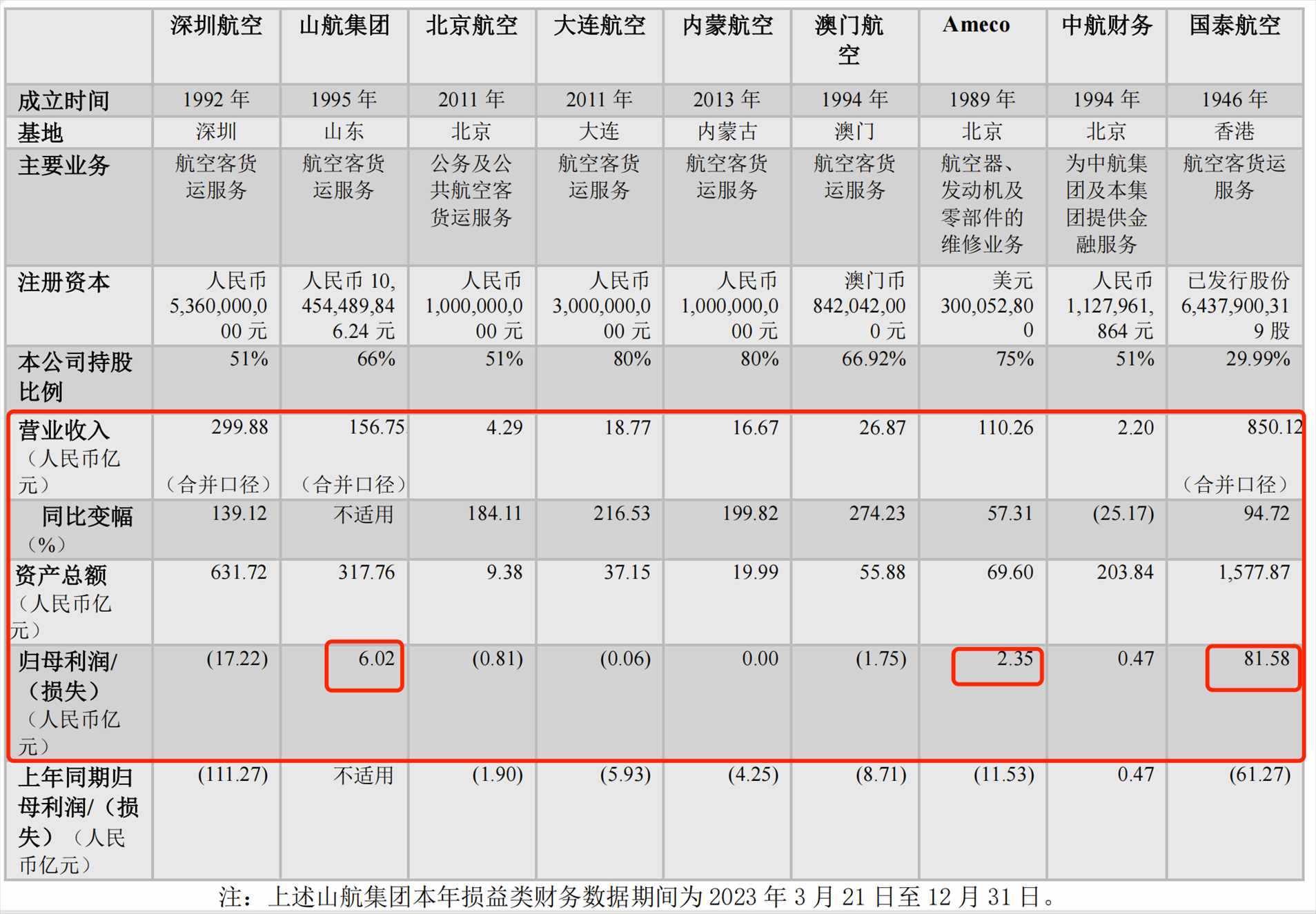 具體來看國航,分別控股和持股的山航集團與國泰航空實現(xiàn)盈利。山航集團去年營收156.75億元,歸母凈利潤為6.02億元;國泰航空去年營收850.12億元,同比增超九成,歸母凈利潤為81.58億元,上年同期為虧損61.27億元;內蒙古航司實現(xiàn)營收16.67億元,同比增近2倍,歸母凈利潤為0元,上年同期為虧損4.25億元。航空器維修公司Ameco去年營收110.26億元,同比增57.31%,實現(xiàn)歸母凈利潤為2.35億元,去年同期為虧損11.53億元。