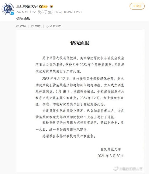 ·重慶師大通報“美院原院長與學生有不正當關系”:黨紀政務處分。