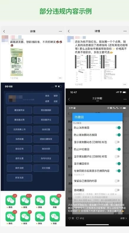 3月26日,微信安全中心發(fā)布《針對在微信使用“外掛”行為的打擊公告》,《公告》指出,根據(jù)《微信個人賬號使用規(guī)范》規(guī)定,微信明確禁止使用各類“外掛”。但近期發(fā)現(xiàn),有部分用戶存在多次違規(guī)使用“外掛”軟件,或在朋友圈發(fā)布“外掛”售賣信息的行為。對此,微信安全團(tuán)隊進(jìn)行了專項清理,并將持續(xù)加大清理力度。