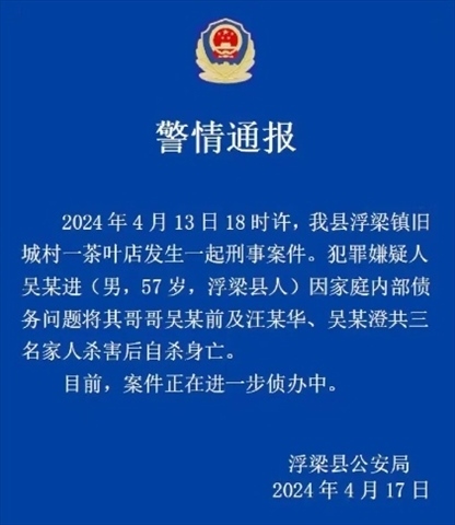 ·警方通報(bào)“知名茶企老板一家三口遇害案”:犯罪嫌疑人因家庭內(nèi)部債務(wù)問題將其哥哥吳某前等三名家人殺害后自殺身亡。