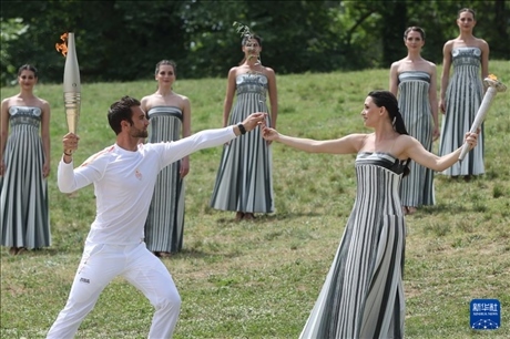 4月16日,第一棒火炬手——希臘運(yùn)動員、東京奧運(yùn)會男子賽艇項(xiàng)目金牌得主斯特凡諾斯·恩圖斯科斯(前左)從扮演最高女祭司的演員瑪麗·米娜手中接過橄欖枝。