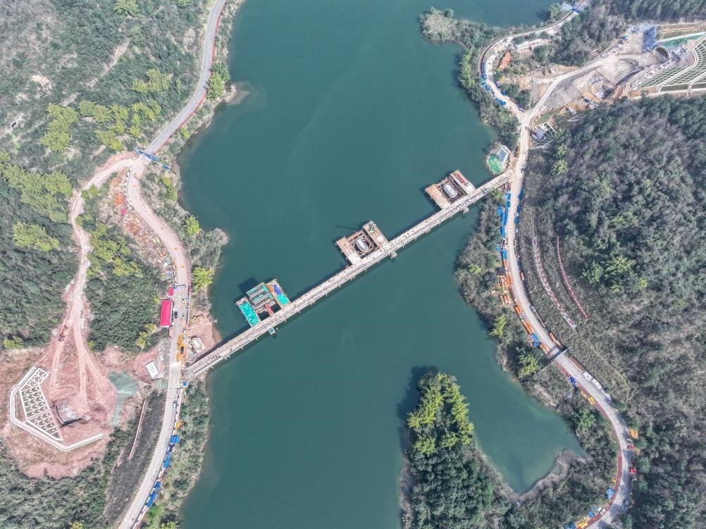這是2月19日拍攝的位于重慶市銅梁區(qū)的成渝中線(xiàn)高鐵玄天湖大橋建設(shè)現(xiàn)場(chǎng)(無(wú)人機(jī)照片)。新華社記者 唐奕 攝