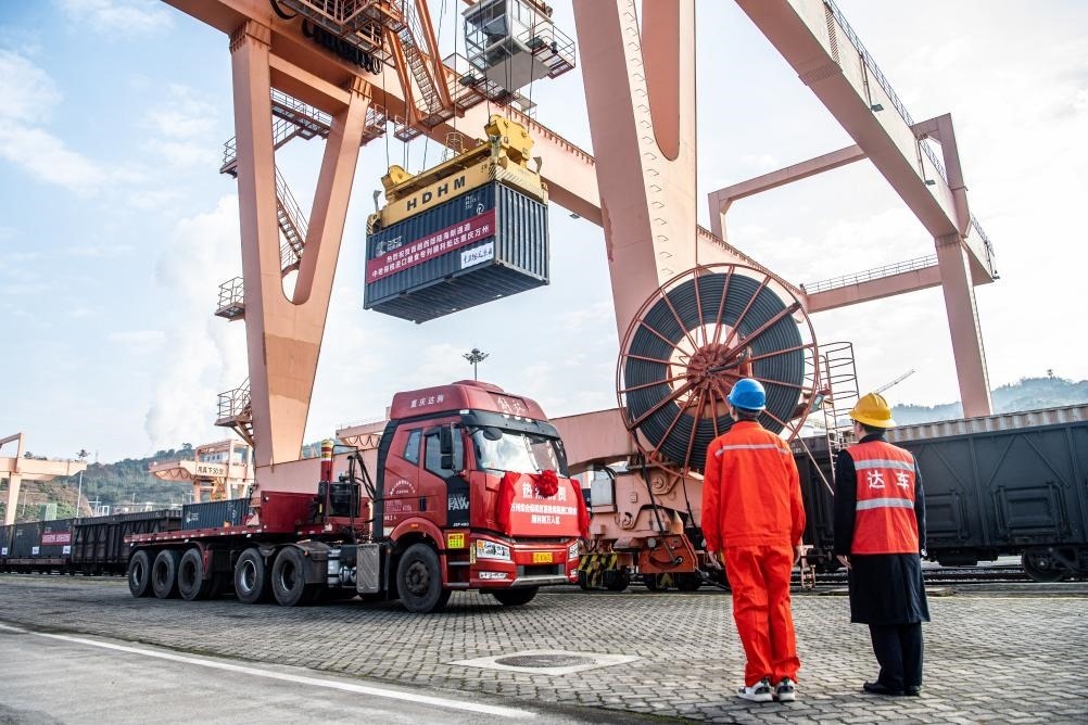 1月4日,在重慶萬(wàn)州新田港站,工作人員進(jìn)行集裝箱吊裝作業(yè),將專(zhuān)列貨物轉(zhuǎn)運(yùn)至公路物流環(huán)節(jié)。新華社記者 唐奕 攝