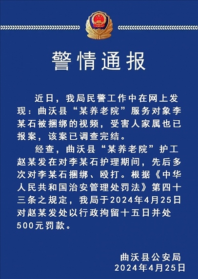 ·山西曲沃縣女子反映父親在一養(yǎng)老院遭捆綁疑被虐待,警方通報:涉事護工行拘15日并罰款。