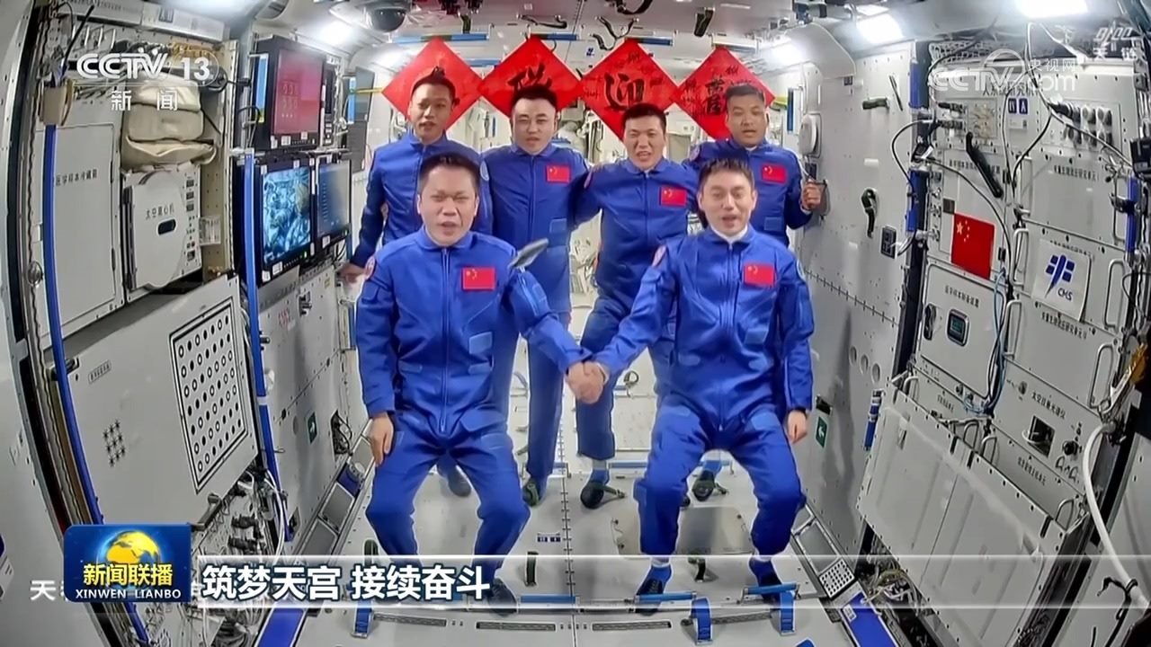 隨后,兩個航天員乘組拍下“全家福”,共同向牽掛他們的全國人民報平安。
