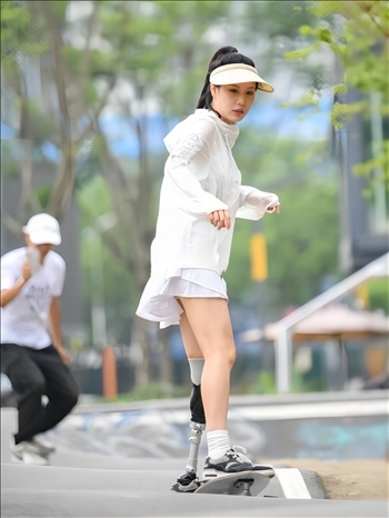 ?下圖為2023年6月20日,胡月在成都市錦江區(qū)輕極限運(yùn)動公園練習(xí)滑板。(新華社記者 王曦 攝)