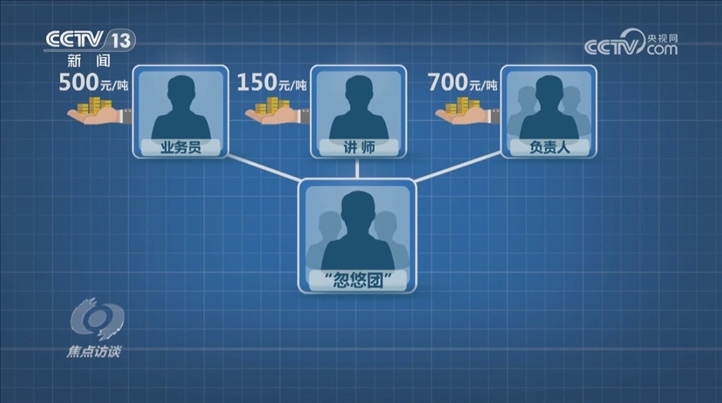 氯化銨和硫酸銨都屬于氮肥的生產(chǎn)原料,成本價約為800—900元/噸。據(jù)專案組調查,幾個代工廠將原料簡單攪拌裝袋后,賣給定制化肥的總經(jīng)銷商張某華,價格就變成1100—1200元/噸,中間差價約300元/噸;總經(jīng)銷商張某華把化肥交付給代理商張某昌,價格為1375元/噸,差價約200元/噸;張某昌轉賣給實體“忽悠團”的價格為1900元/噸,中間差價約500元/噸;“忽悠團”賣給農(nóng)戶的最終價格為3250元/噸,其中:業(yè)務員每噸抽成500元,講師每噸抽成150元,“忽悠團”幾位負責人每噸獲利700元。就這樣,每噸成本不到1000元的氮肥,披著復合肥的外衣,在農(nóng)戶手里翻了三倍多。
