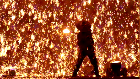 夜幕中,八達(dá)嶺長城流光溢彩。舉目望去,流火似金,濺星如電。但見匠夫一揮臂,沖天鐵花飛寰宇。千萬點(diǎn),夜放花千樹,天地間。