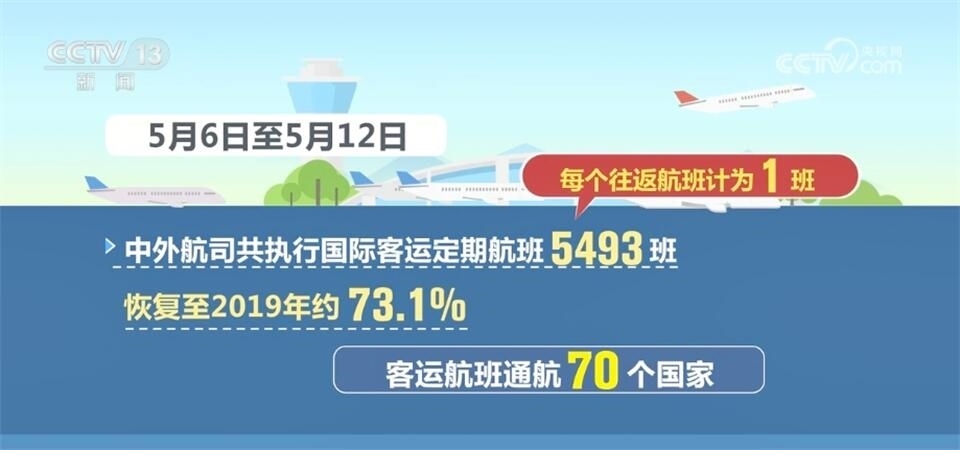 中國民航局?jǐn)?shù)據(jù)顯示,5月6日至5月12日,中外航司共執(zhí)行國際客運(yùn)定期航班5493班(每個往返航班計為1班),恢復(fù)至2019年約73.1%,客運(yùn)航班通航70個國家。
