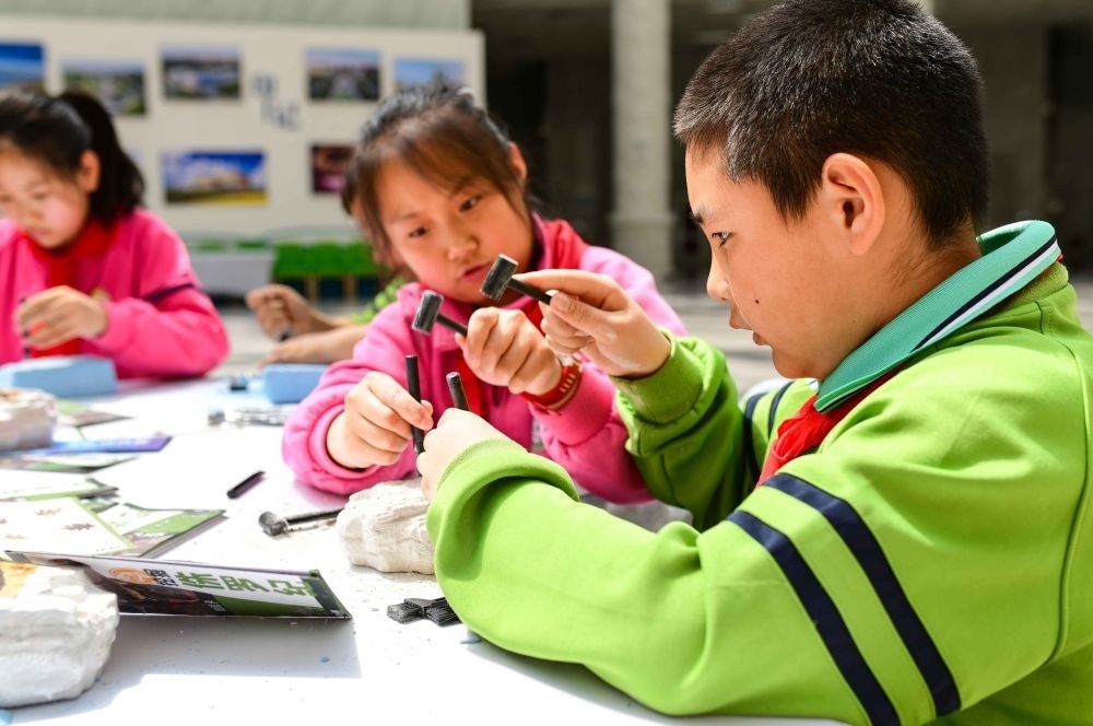 2024年4月22日,內(nèi)蒙古自治區(qū)鄂爾多斯市康巴什區(qū)實驗小學(xué)在康巴什自然博物館開展“探索自然奧秘 保護(hù)地球家園”主題研學(xué)活動,這是學(xué)生在研學(xué)課程中體驗尋找動物化石。