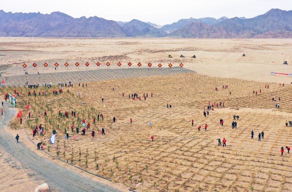 鄂爾多斯市副市長(zhǎng)額登畢力格表示,鄂爾多斯市統(tǒng)籌生態(tài)保護(hù)和新能源開發(fā),集中連片打造庫布其北緣鎖邊林帶、庫布其腹地風(fēng)沙路徑阻隔帶,毛烏素上風(fēng)口阻隔帶、下風(fēng)口阻沙帶,庫布其沙漠“光伏長(zhǎng)城”和毛烏素沙地風(fēng)電光伏“一廊多點(diǎn)”等標(biāo)志性工程,全年計(jì)劃完成沙化土地治理500萬畝。