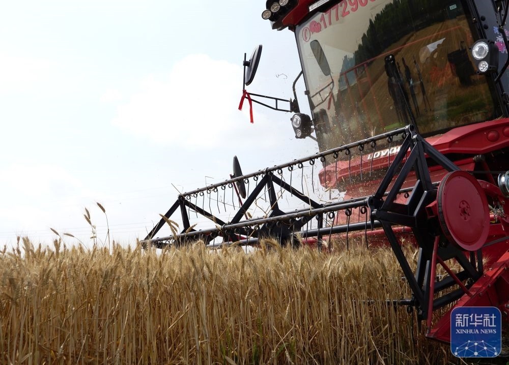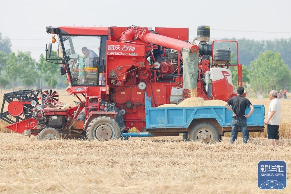 5月26日,在河南省商丘市睢縣尚屯鎮(zhèn)荒莊村,農(nóng)民駕駛收割機搶收小麥。新華社發(fā)(徐澤源攝)