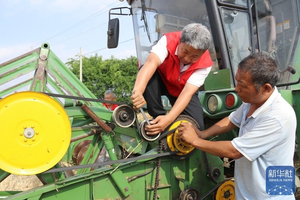 5月26日,在河南省南陽市內鄉(xiāng)縣大橋鄉(xiāng),農(nóng)機服務人員(右二)為跨區(qū)作業(yè)的農(nóng)機手提供免費機修服務。新華社發(fā)(張中立攝)
