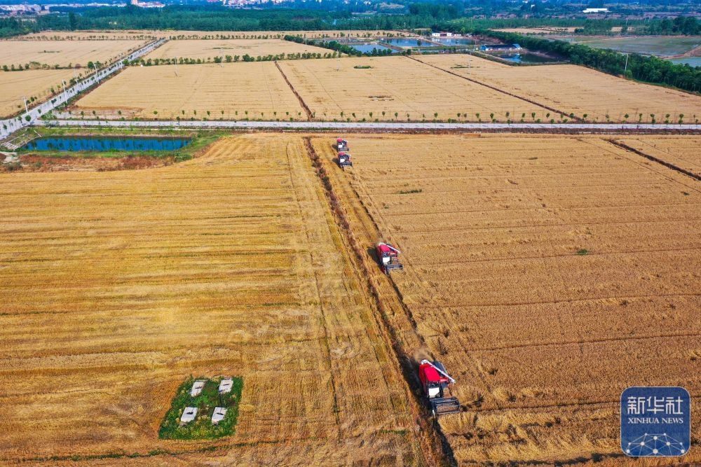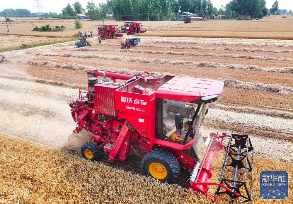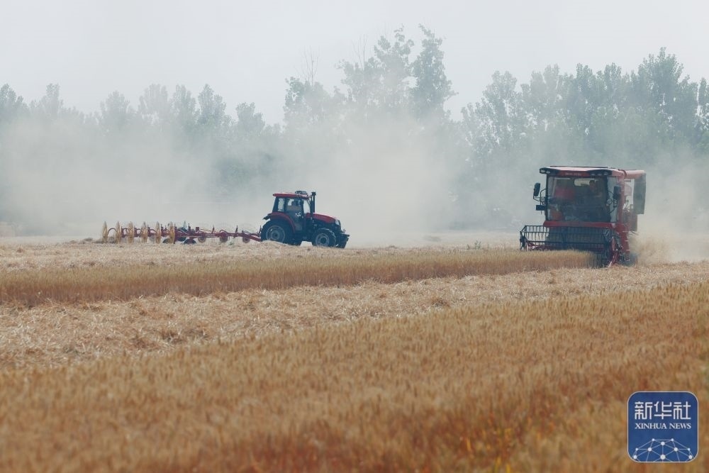 5月25日,在河南省駐馬店市汝南縣三橋鎮(zhèn)殷店村,收割機、秸稈摟草機在麥地里穿梭作業(yè)。新華社發(fā)(張萌攝)