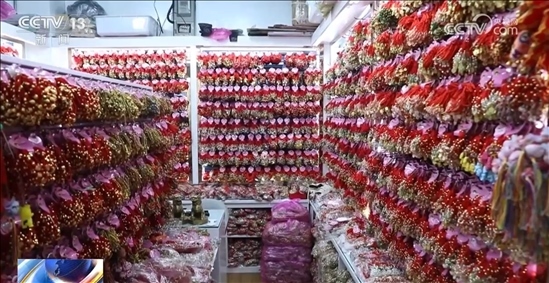 央視網(wǎng)消息:臨近端午節(jié),在浙江義烏,帶有端午元素的五彩繩、手鏈、香囊等各色商品銷售火爆,其中一些蘊(yùn)含龍?jiān)亍⒑迷⒁獾纳唐犯鞘艿绞袌龅臍g迎。