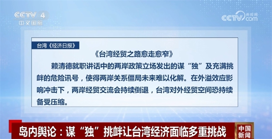 臺(tái)灣《經(jīng)濟(jì)日?qǐng)?bào)》近日發(fā)表題為《臺(tái)灣經(jīng)貿(mào)之路愈走愈窄》的社論指出,賴清德就職講話中的兩岸政策立場(chǎng)發(fā)出的謀“獨(dú)”及充滿挑釁的危險(xiǎn)訊號(hào),使得兩岸關(guān)系僵局未來難以化解。在外溢效應(yīng)影響沖擊下,兩岸經(jīng)貿(mào)交流會(huì)持續(xù)倒退,臺(tái)灣對(duì)外經(jīng)貿(mào)空間恐持續(xù)備受壓縮。