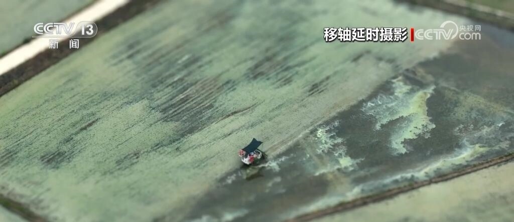 現(xiàn)在您看到的是河南信陽淮河以南的水稻插秧現(xiàn)場(chǎng)。插秧機(jī)在田間穿梭,一株株茁壯的秧苗被整齊有序地植入田間,一會(huì)兒工夫就插滿了整塊稻田??罩懈╊?,一臺(tái)臺(tái)插秧機(jī)在農(nóng)機(jī)手的操控下好似一把把畫刷,在稻田上輕輕暈染,繪就丹青。而同在信陽,淮河以北的麥田里,則是金色的麥浪翻滾起伏,收割機(jī)馳騁田間,飽滿的麥穗被卷入機(jī)艙,經(jīng)過收割、脫粒,顆粒歸倉。