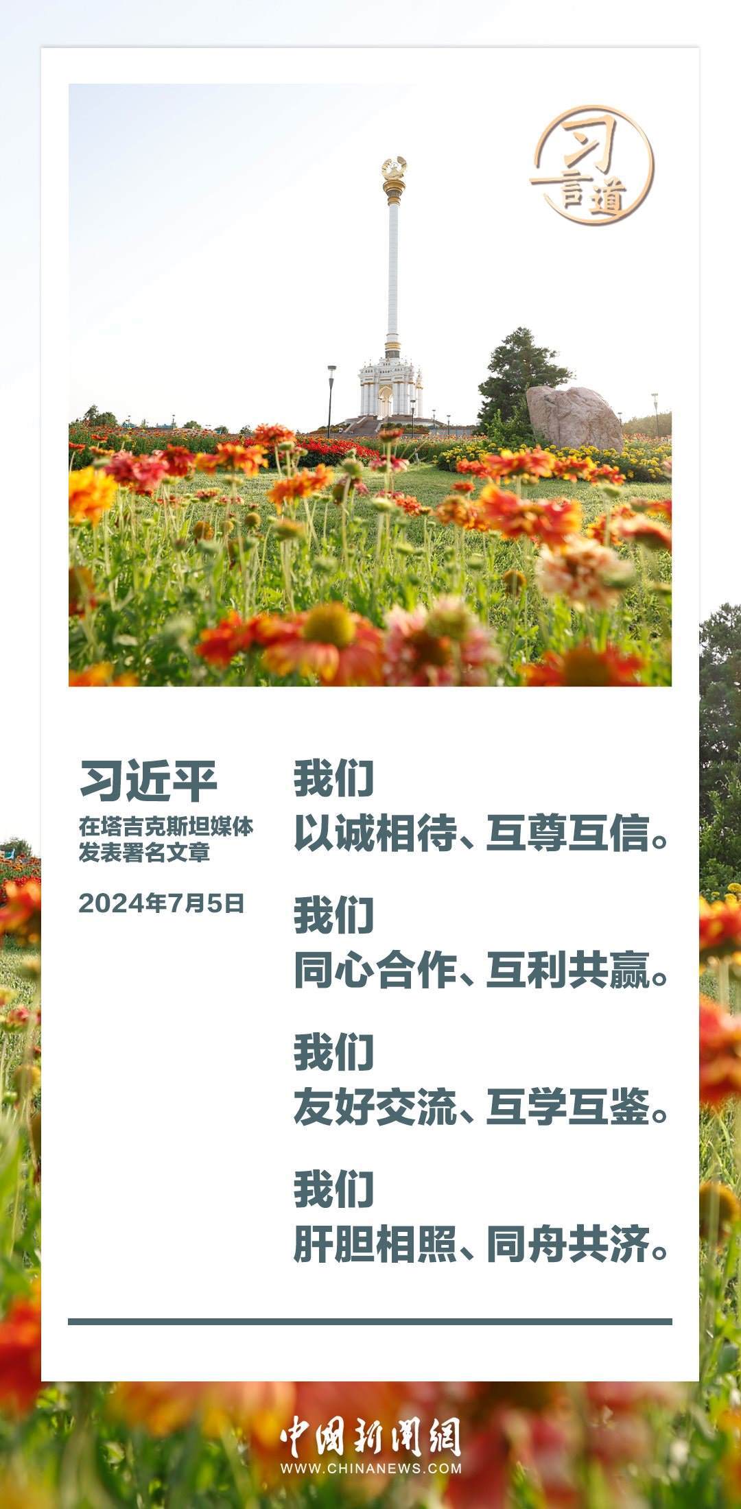 7月5日,在對塔吉克斯坦進(jìn)行國事訪問之際,國家主席習(xí)近平在塔吉克斯坦《人民報》和“霍瓦爾”國家通訊社發(fā)表題為《共創(chuàng)中塔關(guān)系美好明天》的署名文章。習(xí)近平指出——